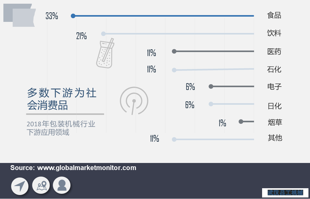 2019年,國內(nèi)包裝設(shè)備制造行業(yè)的主營業(yè)務(wù)收入達(dá)到354.6億元,其中食品、飲料、醫(yī)藥是應(yīng)用比例最高的三個(gè)市場,占整個(gè)包裝的65%。由于食品,飲料和藥品在宏觀經(jīng)濟(jì)運(yùn)作中的敏感性較低,因此包裝行業(yè)的下游需求在總體上是長期向好的,尤其是快消品領(lǐng)域和快遞領(lǐng)域業(yè)務(wù)擴(kuò)張速度快。