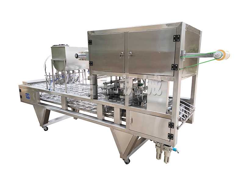 本機采用合理的機械傳動,功能齊全,灌裝、封口、切邊、制品推出,廢料收卷,印碼等自動化工作,可節(jié)約人力,降低成本。本機有二次熱封裝置,料杯/碗/盒與封膜經(jīng)過前后二次熱封,封口牢固可靠。