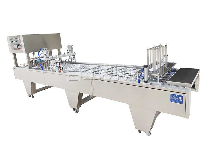 本機采用合理的機械傳動,功能齊全,灌裝、封口、切邊、制品推出,廢料收卷,印碼等自動化工作,可節約人力,降低成本。本機有二次熱封裝置,料杯/碗/盒與封膜經過前后二次熱封,封口牢固可靠。