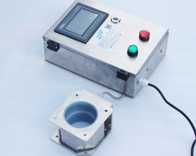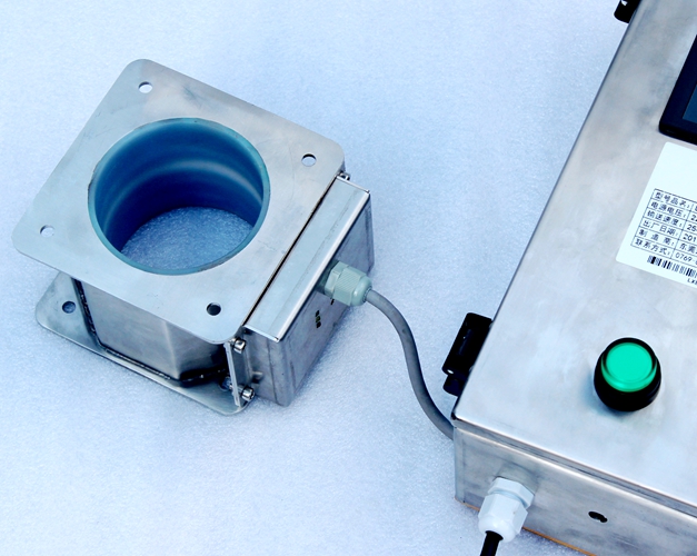 原料從料斗或送料器自由下落進入金屬分離器,如果沒有金屬雜質(zhì),原料會直接通過金屬分離器流向下端的出料口。如果檢測器檢測到原料中含有金屬,那么控制器立刻啟動分離板將金屬物和部分原料一起導向側(cè)面的排料口,然后分流板迅速恢復至正常的位置,分流板速度可調(diào),金屬分離器的檢測精度也可根據(jù)生產(chǎn)需要調(diào)節(jié),最小可檢測并分離出Φ 0.2mm的金屬顆粒。