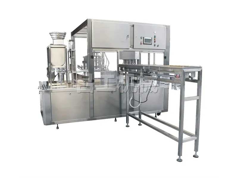 特點:本機從自動定位—自動吹氣—自動定量兩次灌裝—自動清洗—自動下蓋—自動旋蓋—自動出袋